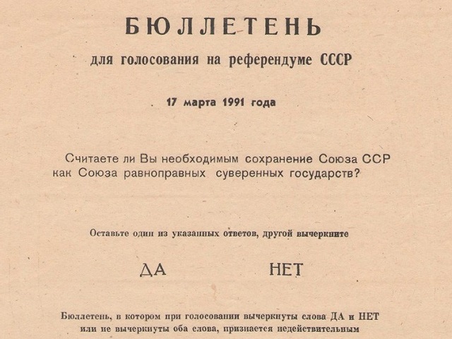 Всесоюзный референдум — который состоялся 17 марта 1991 года, из 185,6 миллиона граждан СССР с правом голоса собрал 148,5 миллиона (79,5%), которые приняли участие в голосовании; из них 113,5 миллиона (76,43%) высказались за сохранение обновленного СССР.